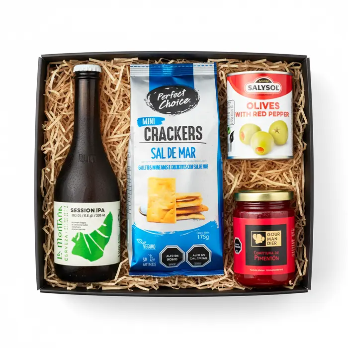 Arma la fiesta donde sea con la Caja La Fonda Chica. Este set destaca por su Cerveza Artesanal La Montaña (750 cc), un formato premium para compartir, acompañada de crackers, aceitunas rellenas y confitura de pimentón. Con packaging personalizable, es el merchandising corporativo perfecto para brindar con estilo y sabor auténtico en estas Fiestas Patrias.