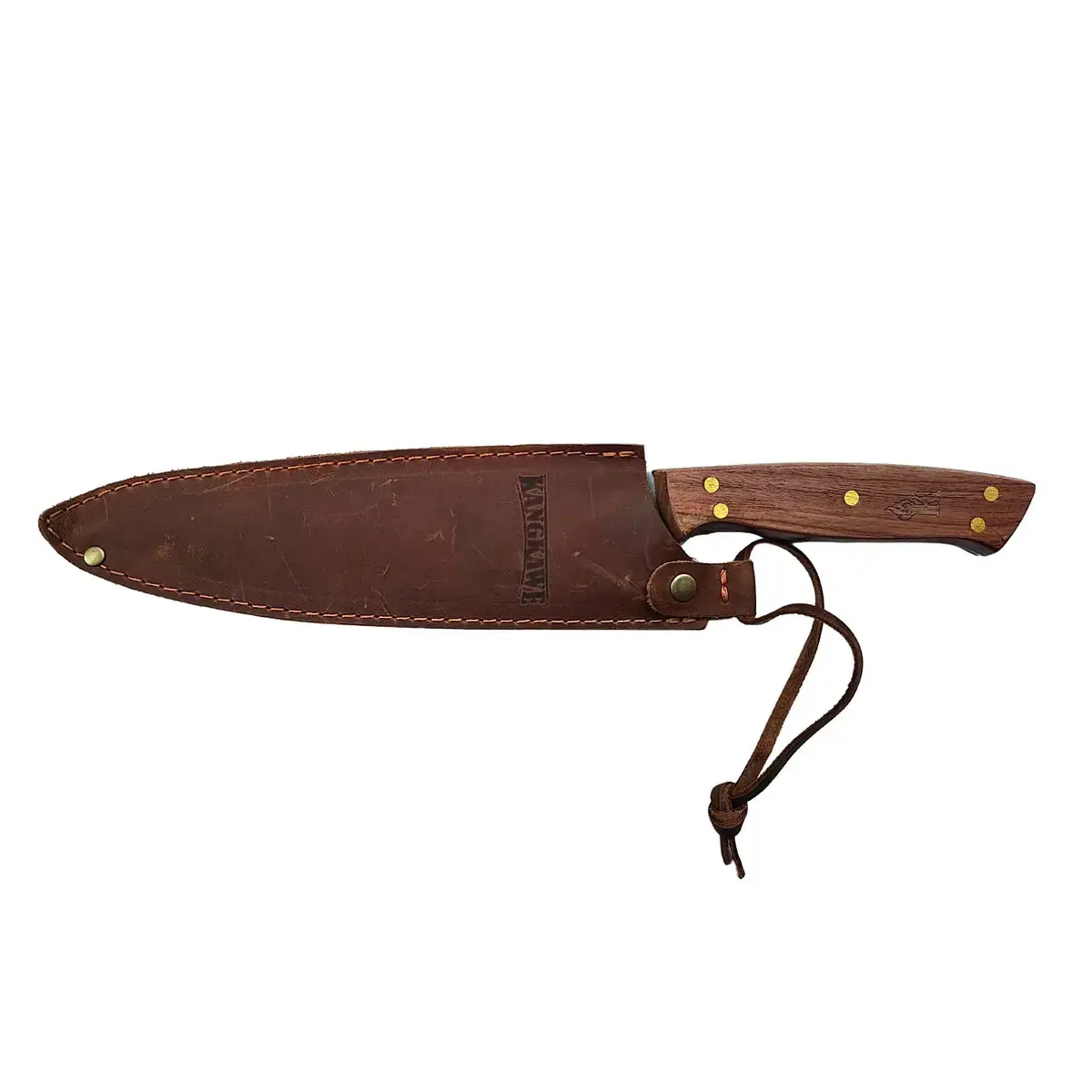 Lo que eleva la categoría de este producto es su funda de cuero color café. Más que un simple protector, es un accesorio artesanal que aporta seguridad al transportar el cuchillo y añade un toque de elegancia y calidez. El cuero protege la hoja del desgaste y evita accidentes, haciendo que sea seguro llevarlo a cualquier reunión.