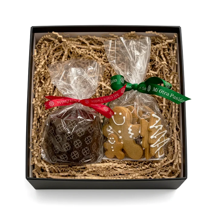 El Toque Divertido: Un saquito lleno de las icónicas galletas de hombre de jengibre, crujientes y especiadas, ideales para compartir o acompañar el café de la tarde.